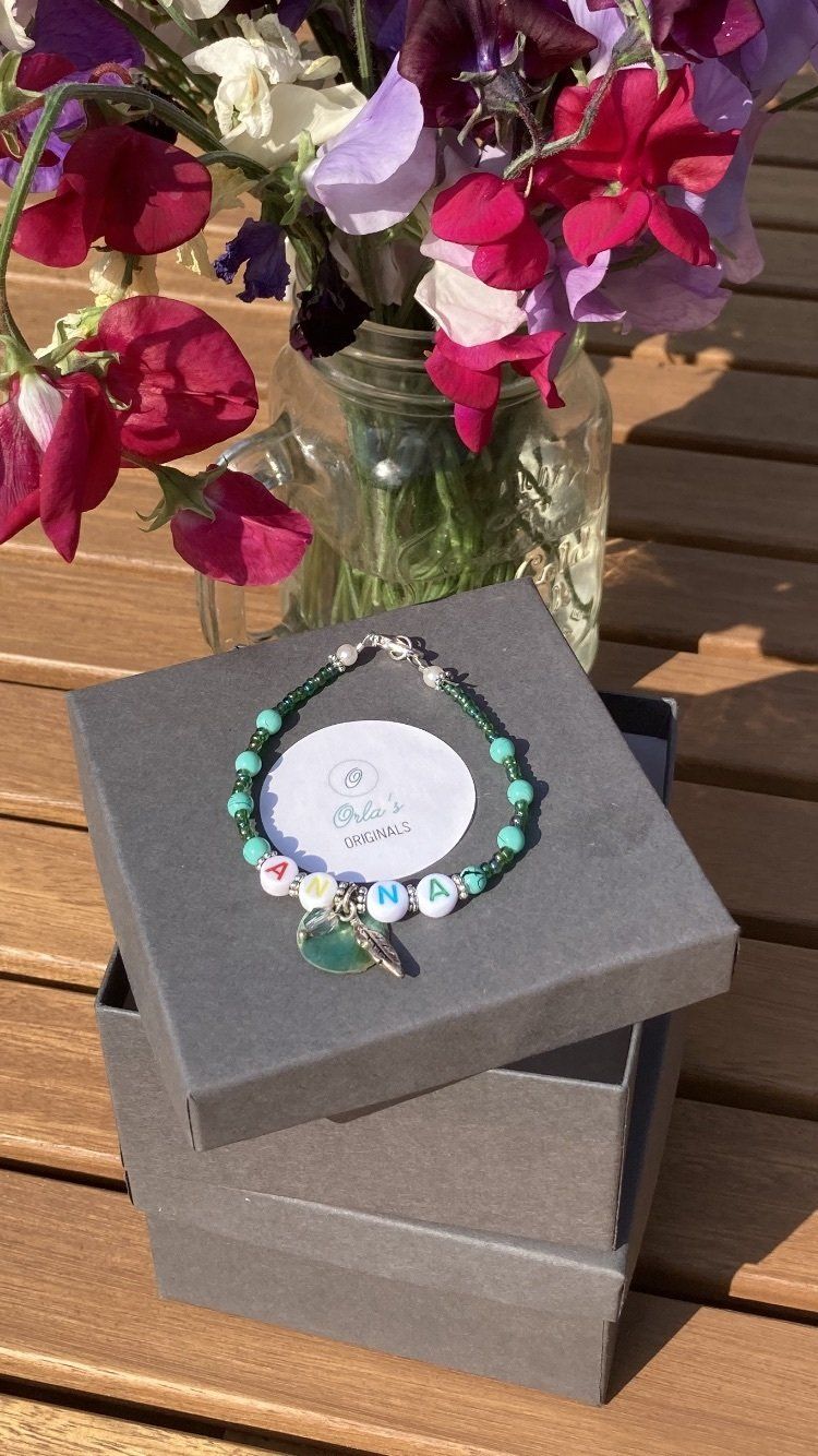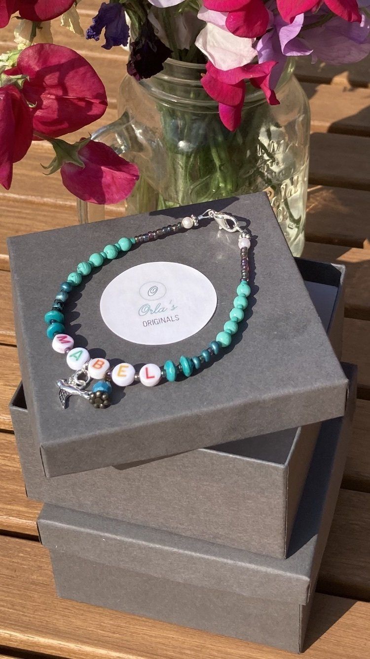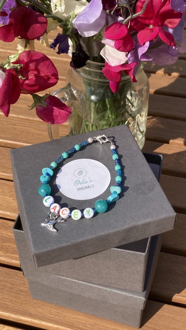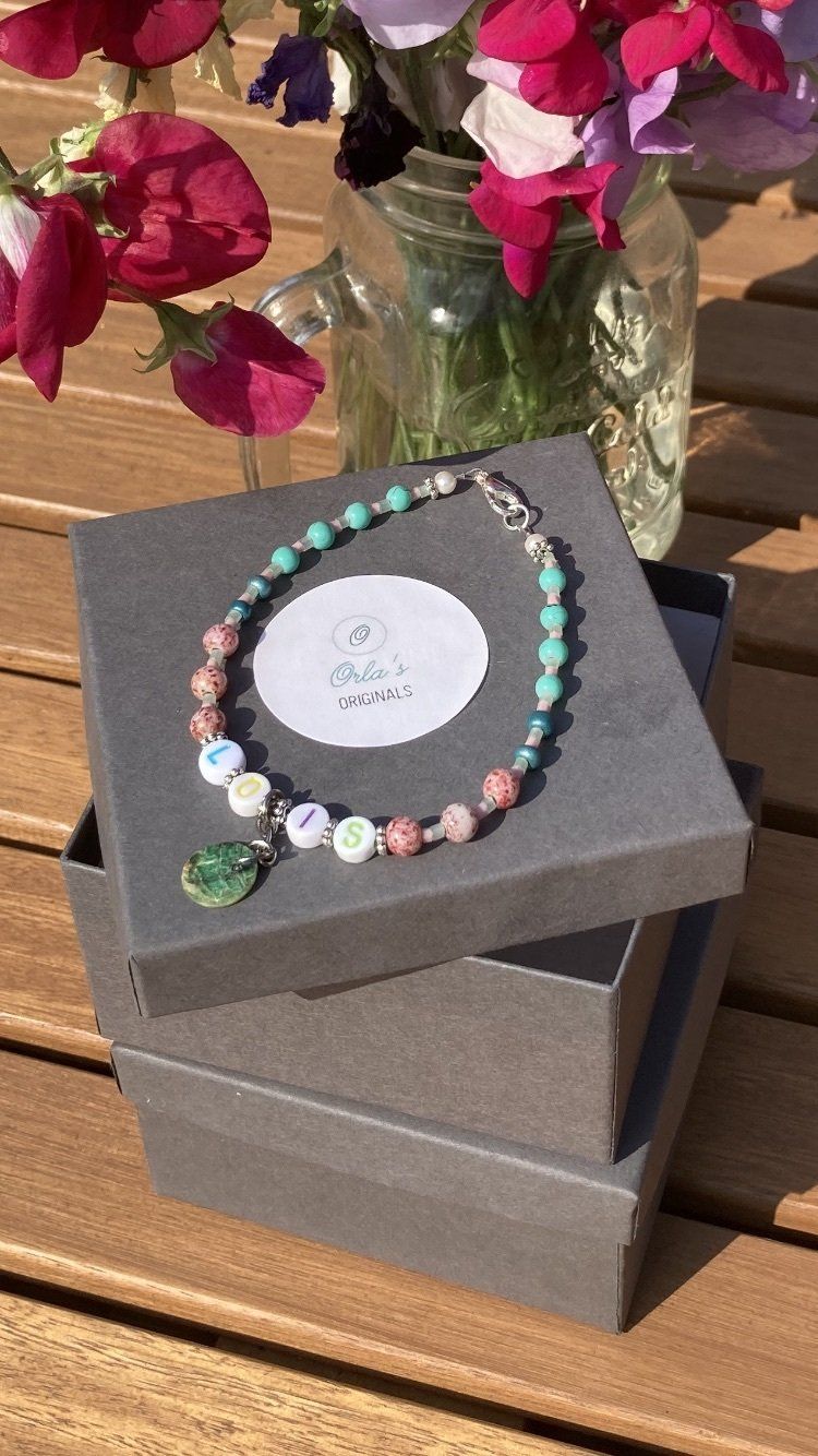 Hi I'm Orla and this is my business. I'm 11 years old and the idea behind these unique bracelets came out of a desire to not give away any more plastic rubbish in my party bags. Having searched the internet I was struggling to find anything beautiful, unique and handmade with an eco ethos so I decided to make my own. These bracelets are made of a mixture of recycled and new beads and you are able to choose a colour theme and the child's name, to create something each child will treasure.