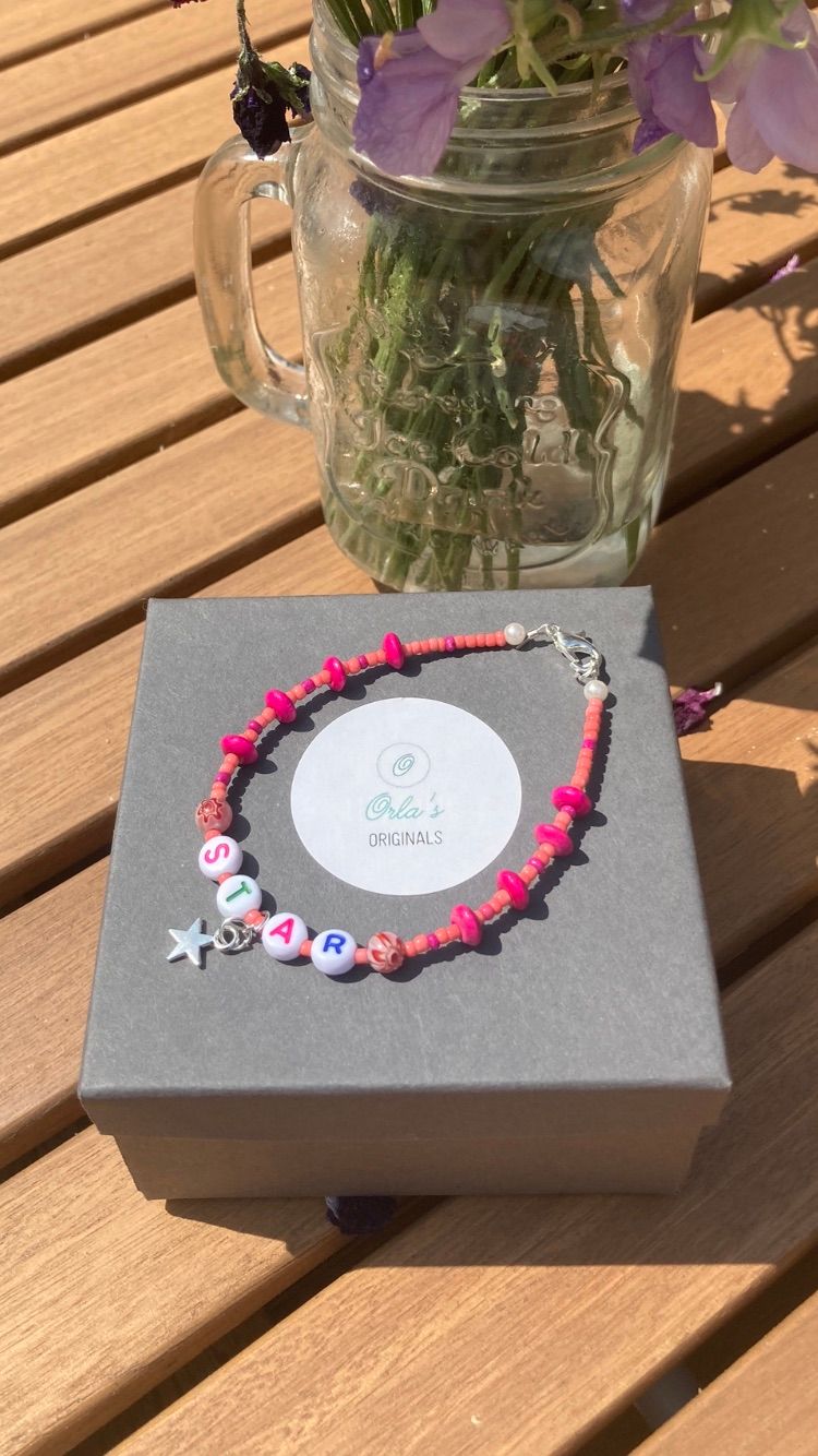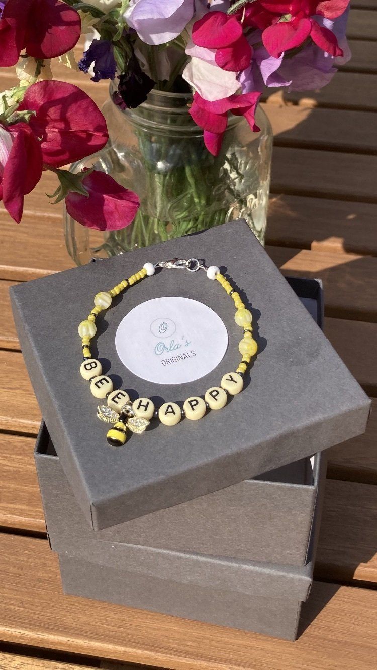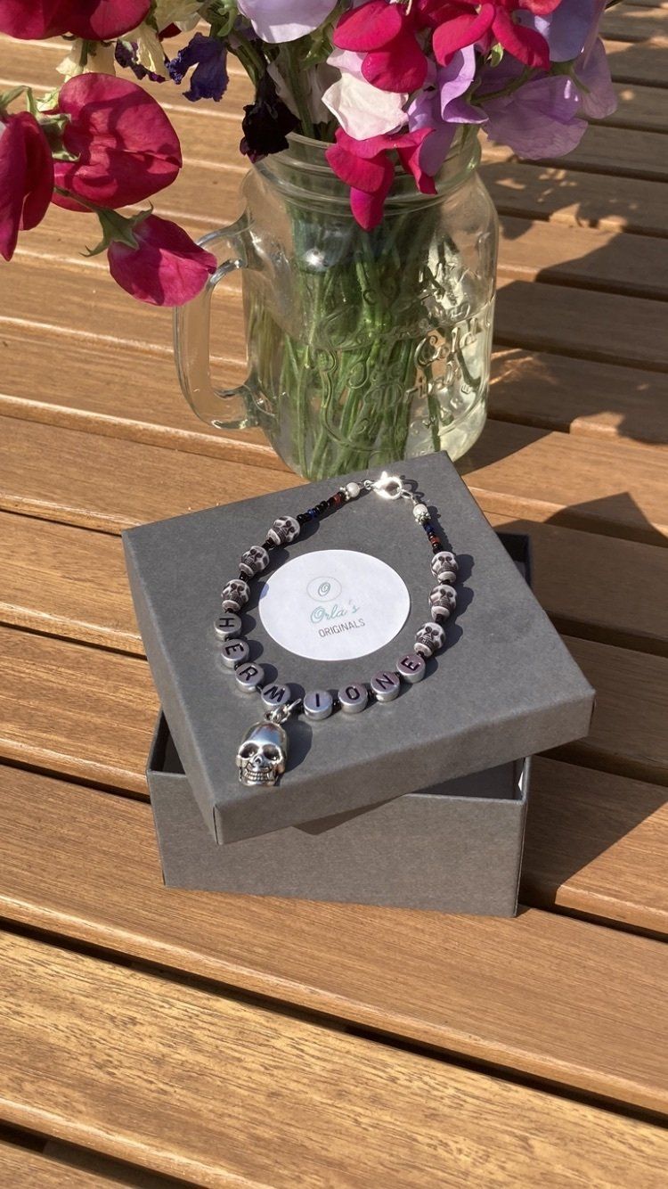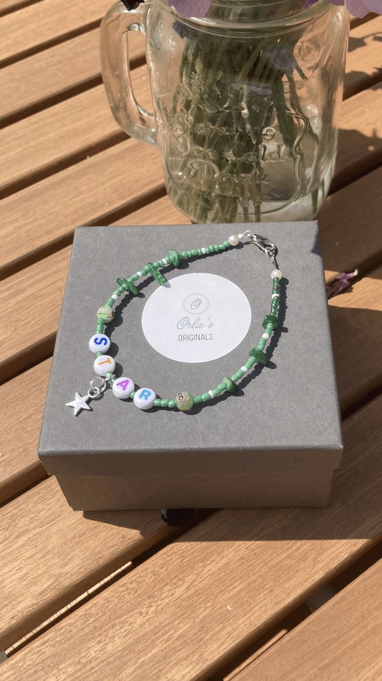 Hi I'm Orla and this is my business. I'm 11 years old and the idea behind these unique bracelets came out of a desire to not give away any more plastic rubbish in my party bags. Having searched the internet I was struggling to find anything beautiful, unique and handmade with an eco ethos so I decided to make my own. These bracelets are made of a mixture of recycled and new beads and you are able to choose a colour theme and the child's name, to create something each child will treasure.